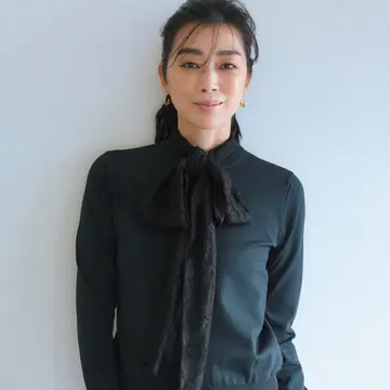 スモーキングにボウブラウスでたたずむ女性。10代のころに見たモノクロ写真が、私のボウタイ好きの原点。絶妙なアースカラーのブラウスは一枚で絵になる美しさだけれど、やっぱり黒ジャケットのパンツスタイルにセンシュアルに潜ませて着こなしたくなる!(編集長K藤)