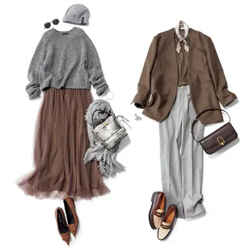 定番色同士の品のよさがきわだつカラーペアリング。優しいトーンのグレーを選ぶとブラウンは軽やかに決まる