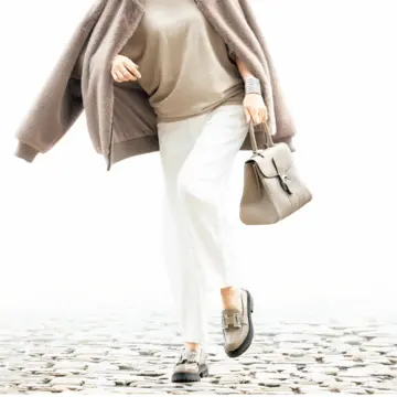 今どきの軽やかなコンサバ感を演出するのに欠かせないのがエレガントローファー。ほどよくデザインが効いているのに主張は控えめ。シルエットはあくまでもスマートなものを選べば、シンプルなパンツスタイルにもリュクス感を呼び込んでくれる。