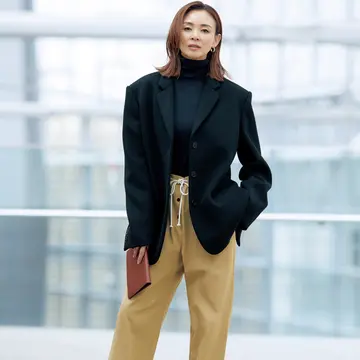 “今、ぜひ目を向けてほしいのがメンズライクで辛口なアイテム。大人の女性は体型も顔つきもまろやかに変化していくからこそ、マニッシュなアイテムでキレのよさを加える……その計算が、おしゃれの更新につながると思うのです。しっかり肩のあるジャケットやシャープなラインのパンツは体をすっきり見せながら、大人の迫力とリュクス感を主張してくれます。張りのある素材には凛とした清潔感があり、鮮度の高いディテールも知的に着こなすことができます。辛口アイテムを主軸にすることで、ジュエリーや小物で加える少量の女らしさが、ぐっと深みを増す点にも注目。相反する奥行きのあるムードは、大人をよりシックに魅力的に見せてくれると思うのです。”