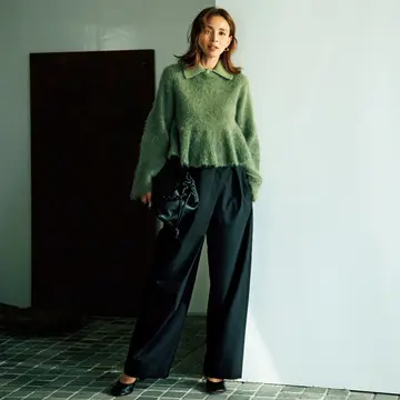 “例えばいつも優美なワンピース姿の人が、ある日サスペンダーパンツをはいていたら……素敵なギャップにときめきます。パンツ自体はセンタープレス入りのタックシルエットできちんとシック。エクラ世代もトライしやすいはず。”