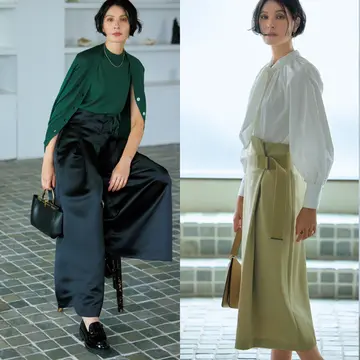 冬のドレスアップを更新するヒントに。ボウタイブラウスには、アシンメトリーなベルト飾りが特徴のストレートスカートを合わせてメリハリを。
