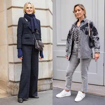 「今から展示会へ行くところ」と話すのはファッション編集者のプリスカ。リックオーエンスのジャケットにマフラーをくるりと1回首に巻いて完成するエディター巻きでこなれた雰囲気に。マルジェラのバッグやMM6のワークパンツでトレンド感あるスタイルは、全体的に白の分量を多めにすることでさわやかに。足もとはニューバランスのスニーカー。