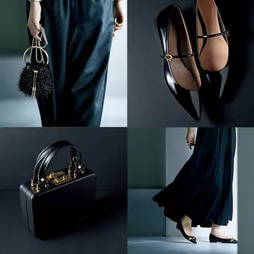 毛足の長いシャギースカートは、今季のトレンドのひとつ。奥深い黒にラメを配したこだわりの素材感なら、大人にふさわしい華やぎと品格、両方を満たしてくれる。Iラインのシルエットもスタイリングしやすく、シンプルな黒シャツをエレガントに格上げするカギに。