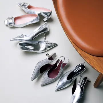 少量でもインパクトのあるシルバーの小物。コーデの仕上げにジュエリーを足す感覚で、小ぶりバッグをスパイス的に効かせるのが、大人の華リュクスな楽しみ方。