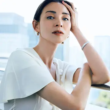 薫風に誘われ、ナチュラルな表情でまとったのは、柔らかく繊細なシルクのマロケン生地で仕立てられたブラウス。深いVゾーンが、美しい首すじを印象的に演出。華やかなケープデザインのショートスリーブとのバランスも絶妙だ。