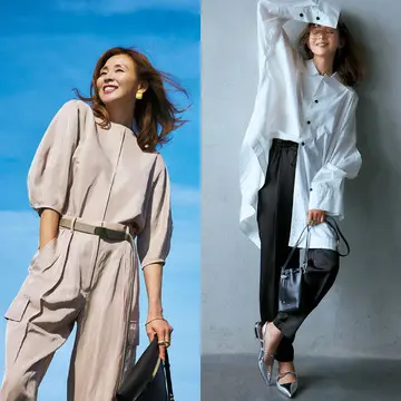 カジュアルパンツは、これからの季節に映えるさわやかなデイリーウエアの筆頭。王道のチノパンツなら、ワイドレッグを選ぶことでぐんと今っぽく。辛口デザインのバックルベルトで装いをほどよく引き締めて。