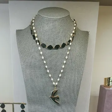 クラスプには実は鳩のモチーフが。こちらをフロントにして、耳もとには同じ黒エナメルの花びらイヤリングを。