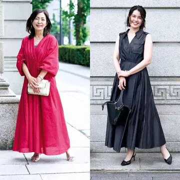 シックな色のワンピースをマルチカラーバッグで夏らしく