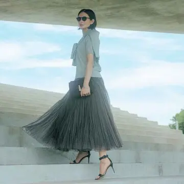 スカート¥48,400/Chaos GINZA SIX(カオス) ブラウス¥35,200/オーヴィル カスタマーサービス(オーヴィル) サングラス¥53,900/ルックスオティカジャパンカスタマーサービス(オリバーピープルズ) ピアス¥155,100・バングル¥985,600/ヒロタカ 表参道ヒルズ(ヒロタカ) ストール¥26,400/アイネックス(アソース メレ) バッグ¥115,500/ブルーベル・ジャパン[ファッション事業本部](ワンドラー) 靴¥82,500/アマン(ペリーコ)