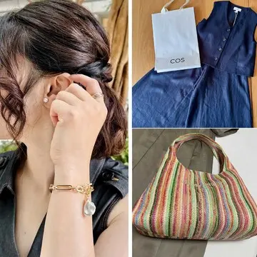 ディナーの予定がある日は、ラルフ ローレンのビビッドなプリントドレスとシャネルのバッグ、ゴールドのローヒールサンダルでシック&ゴージャスに装って。コーデの仕上げには、大好きでコレクションしているというヴィンテージジュエリーを。夏のお出かけファッションに、小物でさらなる華やぎを加えた。