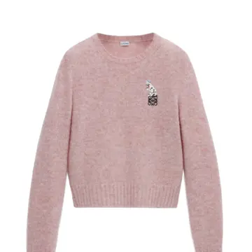 ウェアや冬のおしゃれを彩る小物にも猫モチーフがあふれています。ソフトピンクのウールセーター(写真左)は、胸元にフューチャリスト キャットとロエベのアナグラムの刺繍が施されています。さらっと着ておしゃれに決まるシンプルなデザインと思いきや、背面の裾部分にもう一匹あしらわれたチャーミングな一着。