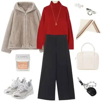 体型を選ばず着られるコクーンシルエットに、リブ編みのボトルネックがスタイリッシュな印象のニット。年末年始の旅行にぜひおすすめなのが、フリース素材のデニム風パンツとのコーディネート。色落ち感やディテールがブリントで表現され、デニムにしか見えないけれど、デニム特有のごわつきがなくはき心地が快適だから、電車や車移動の多い旅行にうってつけ!足もとはボリュームスニーカーでアクティブに。