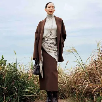 エクリュカラーの着こなしに、千鳥格子柄とペイズリー柄がミックスされた同トーンのストールでアレンジを加えていたナイラ。首まわりにボリュームのあるニットだからこそ、ストールは顔まわりに巻かずにラフに肩にかけてアクセントを。スタイリングのスパイスになった辛口レザーボトムも、長く垂らしたスカーフがまろやかな繋ぎ役となって、装い全体をお洒落にまとめています。バッグはヴァレンティノ、スエードのローファーはジョセフのものだそう。