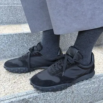 最近のスニーカートレンドであるロープロファイル(=ソールが薄くて甲の高さの低いスニーカー)のレトロなモデルは、すべて表革のホワイトレザーで清潔感あるデザイン。すっきりとしたフォルムなので、足もとにボリュームをつけない着こなしの仕上げに活躍する。「ニューバランスでローテク!?と思うかもしれませんが、バレエシューズ感覚で履けそうな一足。柔らかなナッパ素材なので、スニーカーというよりもフラットシューズのようなファッション感覚で取り入れやすいデザインだと思います」。