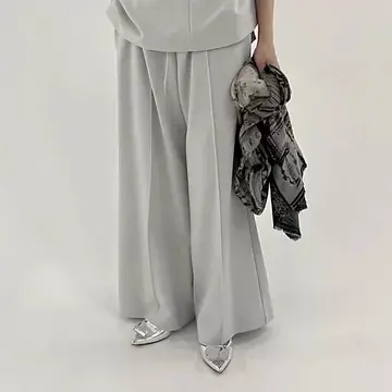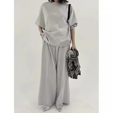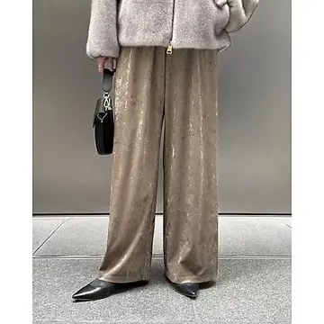 ウエストは程よくフィットし、ヒップや太もも周りもすっきり。ワイドシルエットなので脚のラインを拾わず、動くたびに柔らかなドレープが出てきれいです。丈は足首までしっかりあり、ヒール合わせでバランス良く着られます。ベロア素材ならではの上品な光沢が、シンプルなトップスを合わせるだけで華やぎをプラス。写真のようにボリューム感のあるフーディでカジュアルに、ブラウスやニットでエレガントにと、幅広い着こなしが楽しめる一本です。