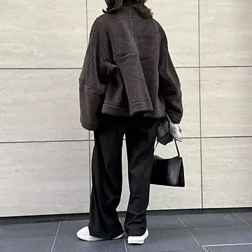 ふわふわのプードルファーが魅力のRoom no.8のコートは、軽さと暖かさを兼ね備えた一着。ヒップが隠れる着丈で、155cmでもバランスよく着られます。身幅はゆったりしているので、厚手のニットを重ねてももたつかず、袖も長すぎないため抜け感のある着こなしに。大きめのカラーが顔まわりを華やかに見せ、シンプルなコーディネートに上質感をプラスします。デイリーにもお出かけにも活躍する、冬の主役アウターです。