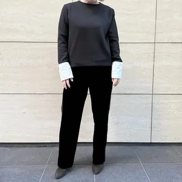 袖にカフスがついたブラウスは、腕を長く見せてくれて着やせ効果も発揮してくれます!特に私が購入した黒が、やせ見え行が絶大でおすすめ!薄めのダンボール素材なので、ニットのインナーとしても着用可能。カフス部分だけ見せたレイヤードファッションも楽しめてとってもお洒落♪春先まで使えるので一枚あると便利です。同じく宮崎桃代さんコラボのダンボールジョガーパンツも買おうかどうか迷い中(˘ーωー˘)うーん!