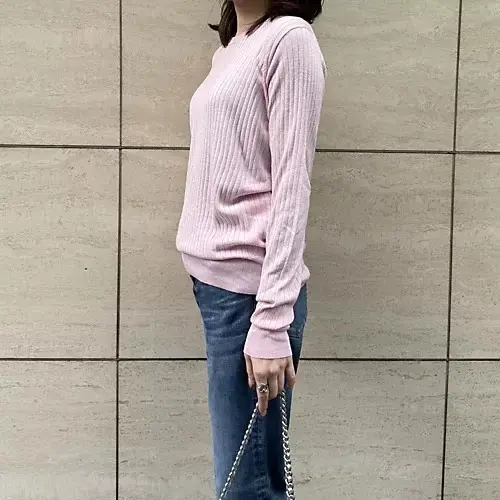 ピンクを選んで大正解。淡い色合いが顔まわりを明るく見せるだけでなく、リブのピッチと絶妙なゆとりが細見え効果を発揮。シルクのさらりとした肌ざわりとカシミヤの柔らかさで、着るたびに心地よさに包まれる。クルーネックの開き具合も上品で、どんなボトムにも合わせやすい万能ニット(^_-)-☆
