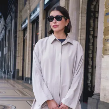 ダスのスニーカーとセリーヌのバッグも色みをそろえて。サングラスでも新しさを取り入れているという彼女。「今シーズンはサンローランを買いました」。