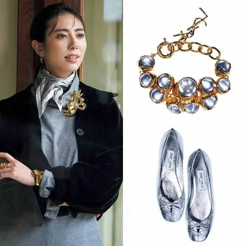 まばゆいシルバーグリッターは、全身に今どきの勢いを加えるパワーあり。パールのアクセントにもときめく。