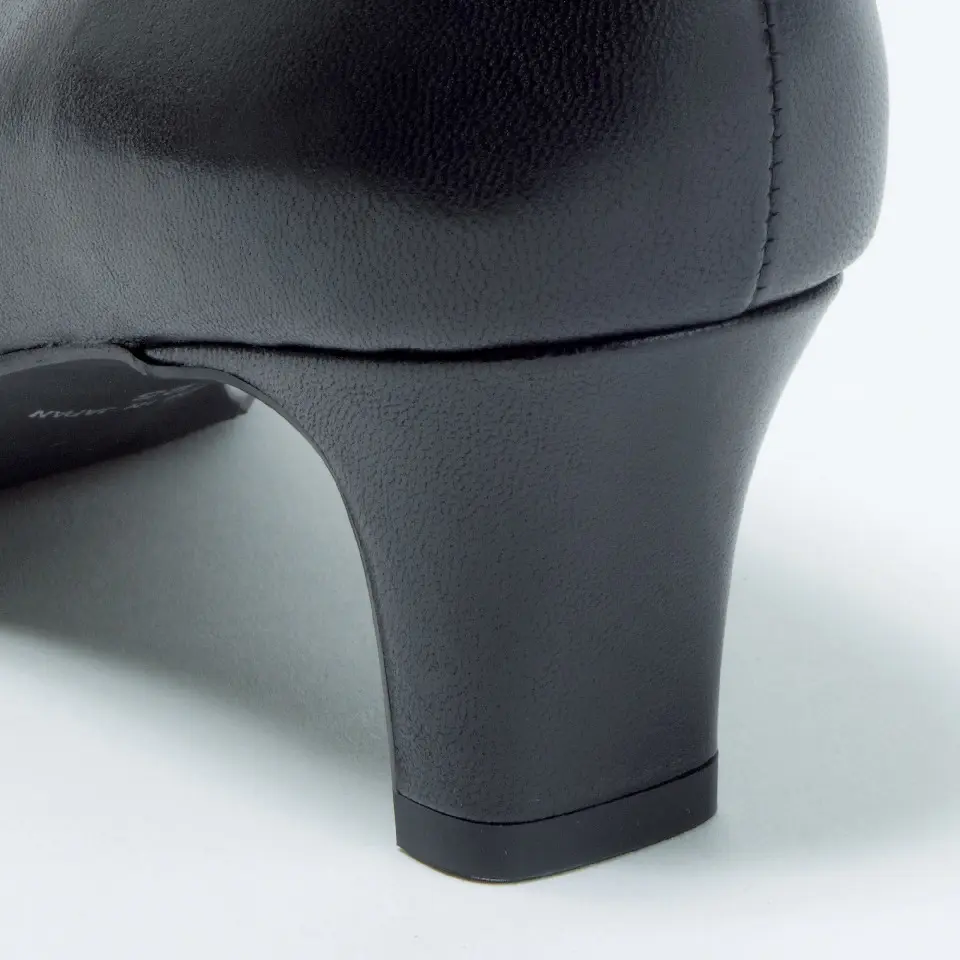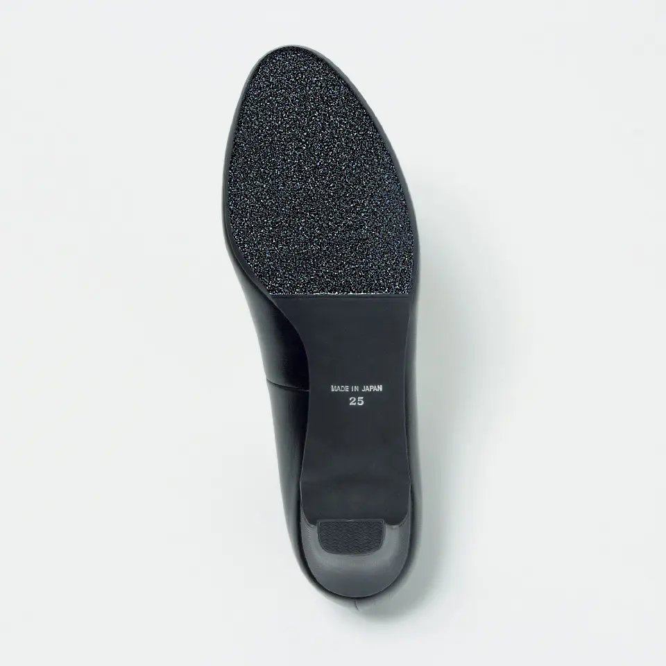 シンプルな美しさと履き心地のよさに徹底的にこだわった黒パンプス。葬儀はもちろん、オケージョンからデイリーまでさまざまなシーンで活躍してくれる。微光沢の上質なレザーには撥水加工が施されており、悪天候の日にも対応可能。