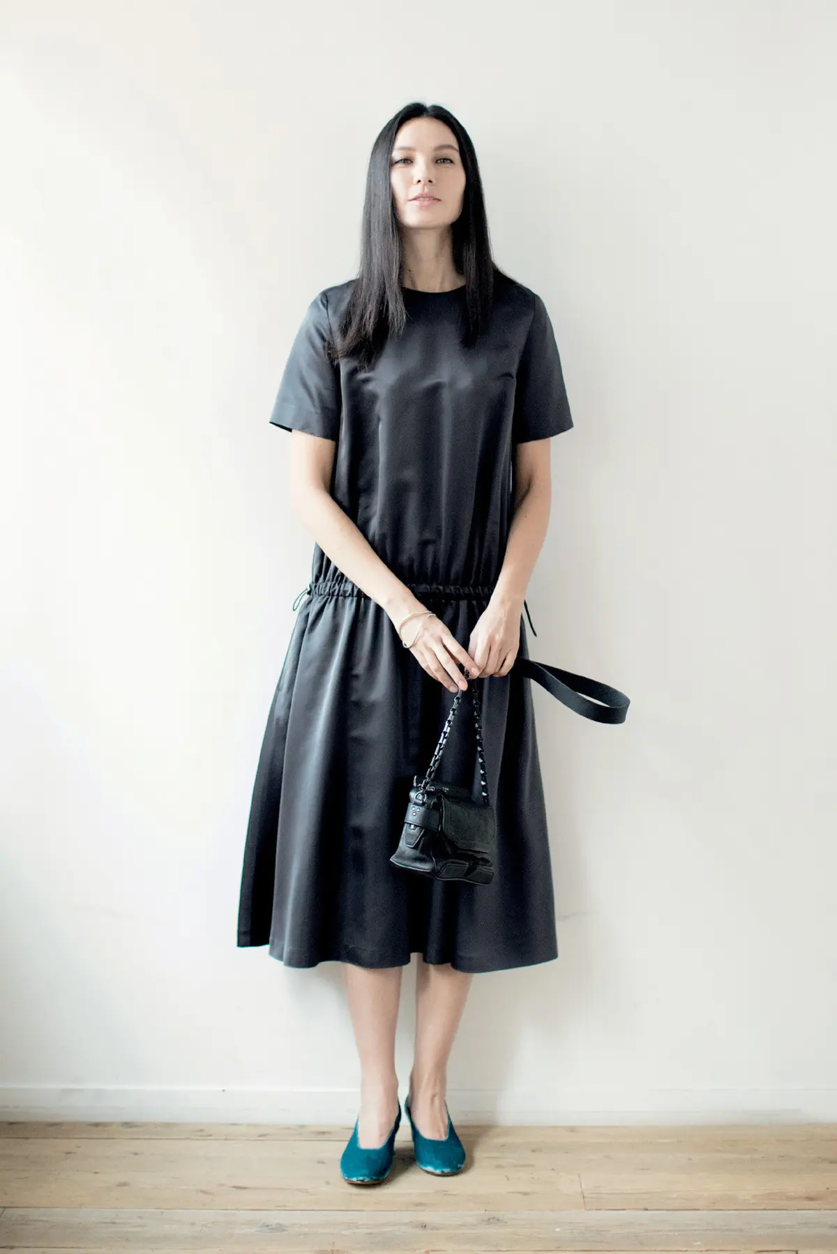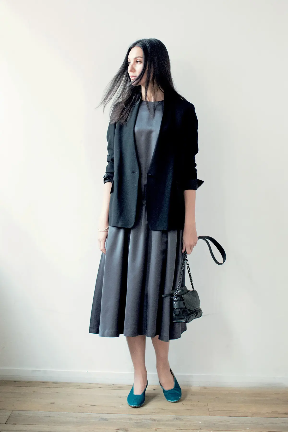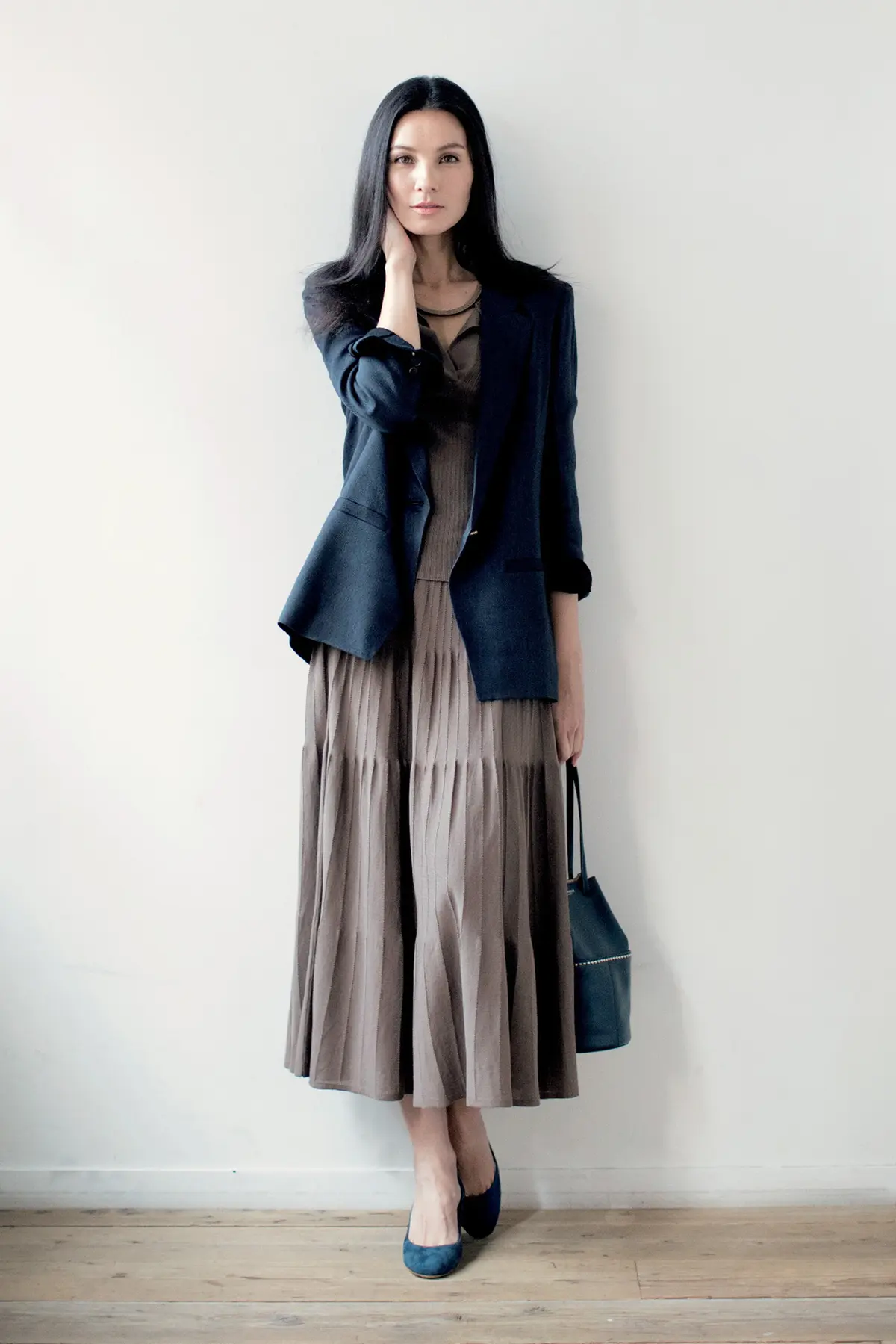 ジャケット¥58,000/ミューズ ドゥ ドゥーズィエム クラス 表参道店(ドゥーズィエム クラス) ワンピース¥53,000/ebure(エブール) バッグ¥70,000/ラグ&ボーン 表参道(ラグ&ボーン) バングル¥53,000/ドゥロワー 青山店(アロム) 靴¥73,000/ギャルリー・ヴィー 丸の内店(マルティニアーノ)