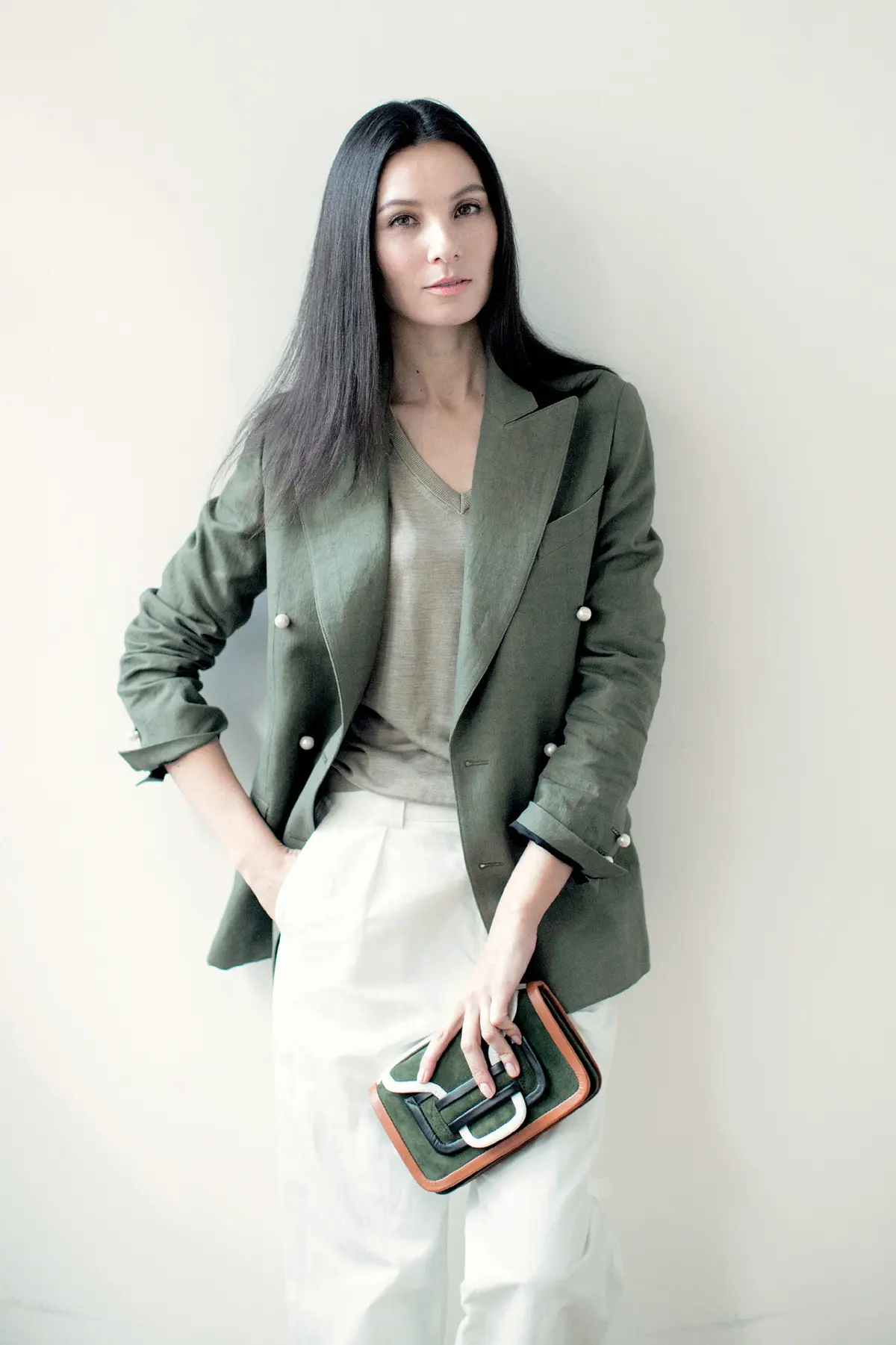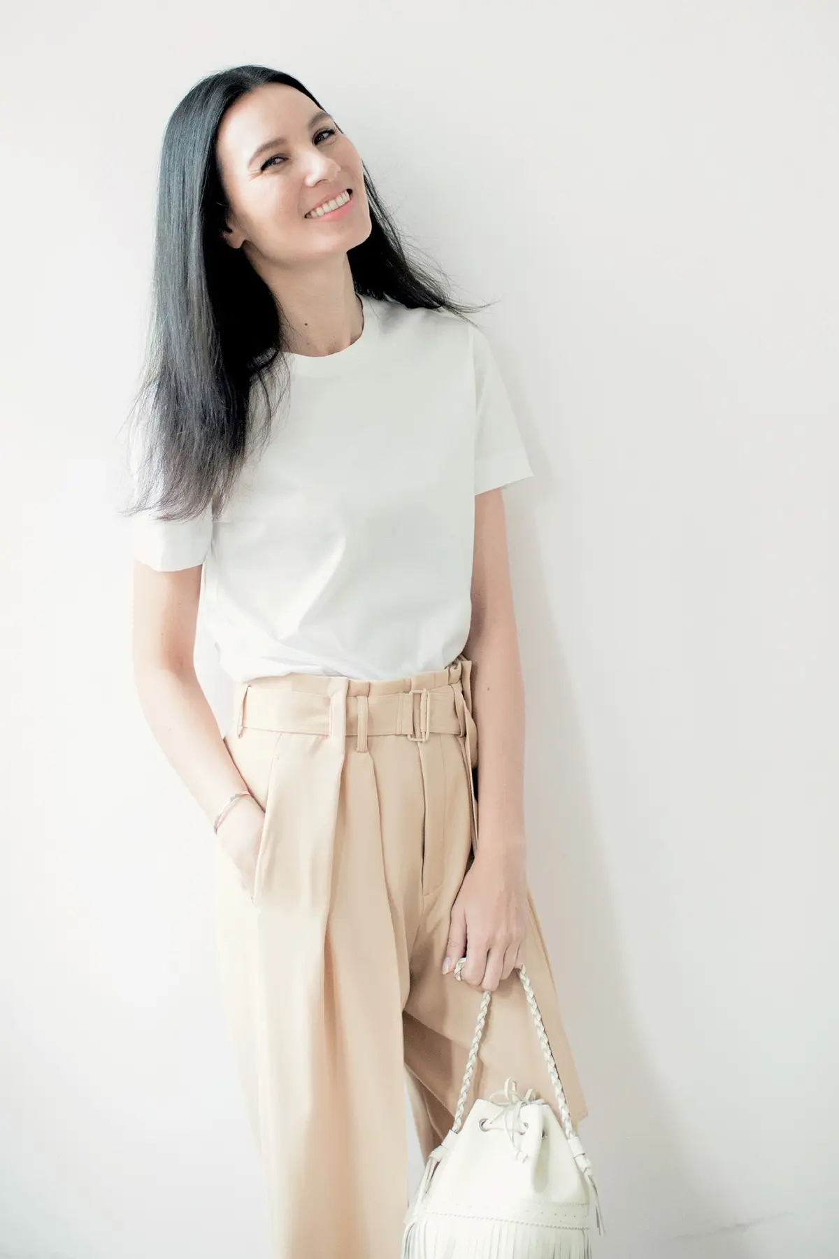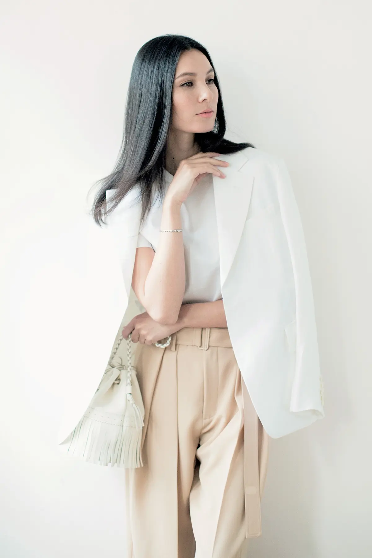 ジャケット¥87,000/アマン(アンスクリア)Tシャツ¥7,800/スローン(スローン) パンツ(共布ベルトつき)¥59,000/ヴィンス 表参道店(ヴィンス) バングル¥18,000/KAORU 伊勢丹新宿本店(カオル) バッグ¥142,000/アングローバルショップ 表参道(J&M デヴィッドソン)
