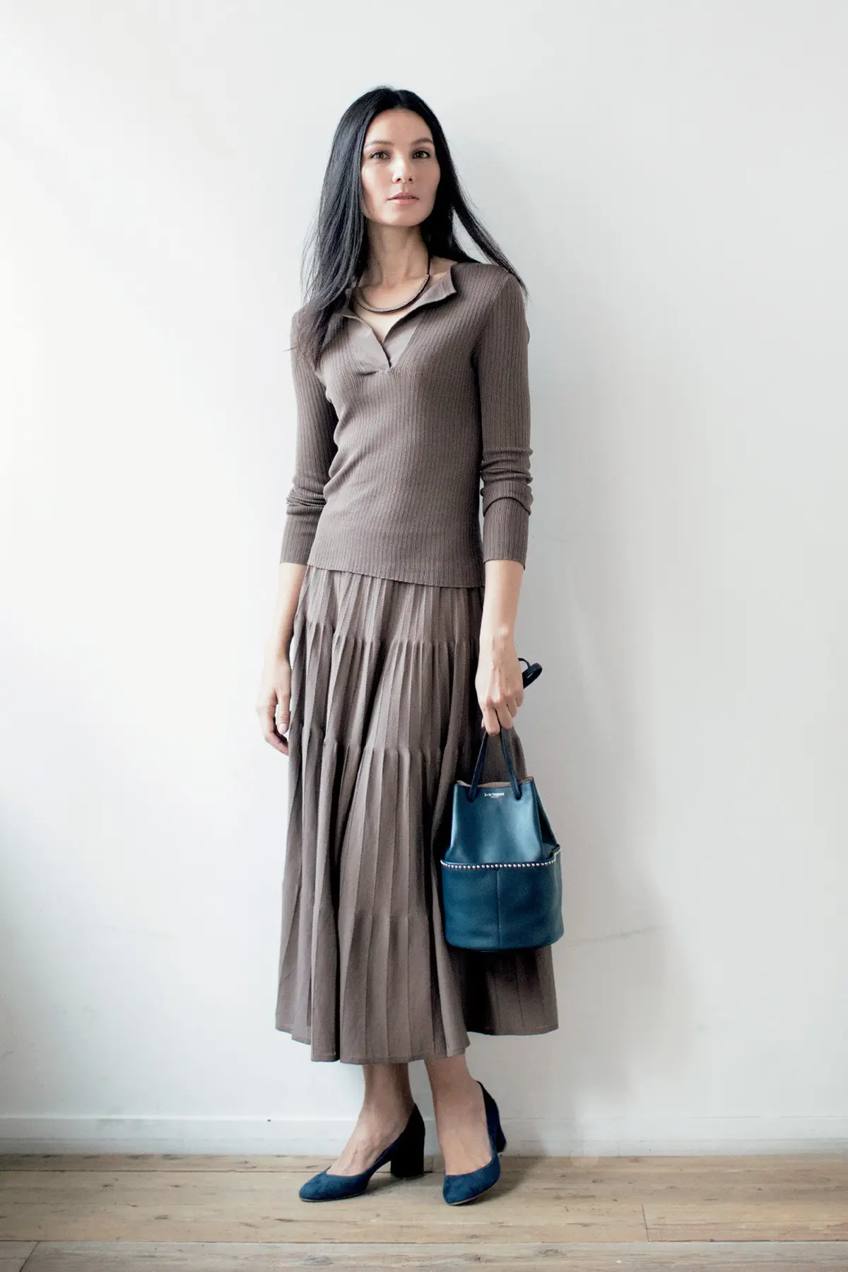 ジャケット(4月入荷予定)¥56,000/アングローバルショップ 表参道(テラ) ニット¥72,000・スカート¥135,000/マディソンブルー(マディソンブルー) ネックレス¥26,000/ギャルリー・ヴィー 丸の内店(クレッシオーニ) バッグ¥154,000/J&M デヴィッドソン 青山店(J&M デヴィッドソン) 靴¥24,000/ハイブリッジ インターナショナル(ファビオ ルスコーニ)