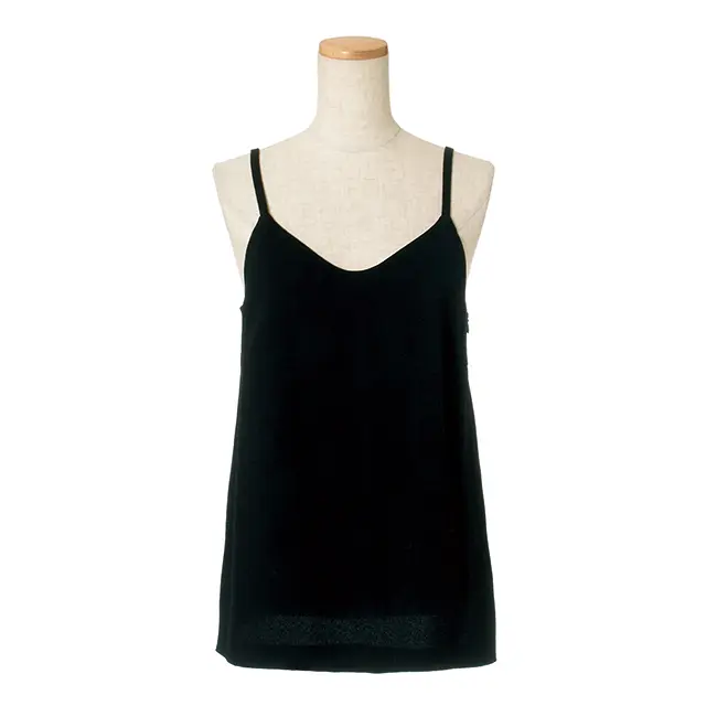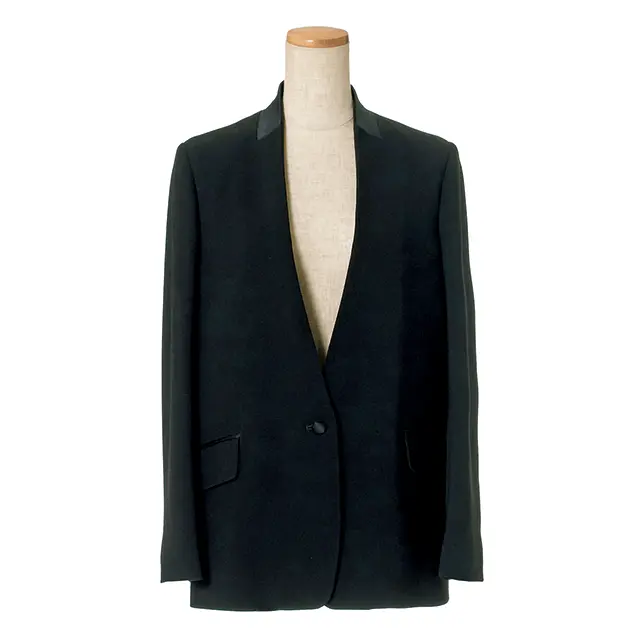 ジャケットはキレのよさと女性らしさが感じられるノーカラー仕立て。ボトムはエクラプレミアムで一度完売した人気の裾リブパンツ。セットアップで着こなせば、どんな場でも気後れすることのない程よいきちんと感と華やかさが。インナーは胸もとのあきにこだわった万能なキャミソール。
