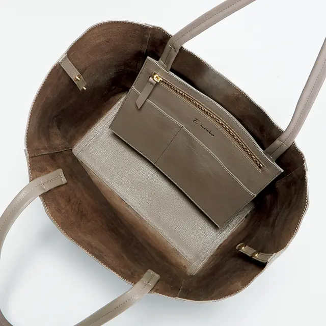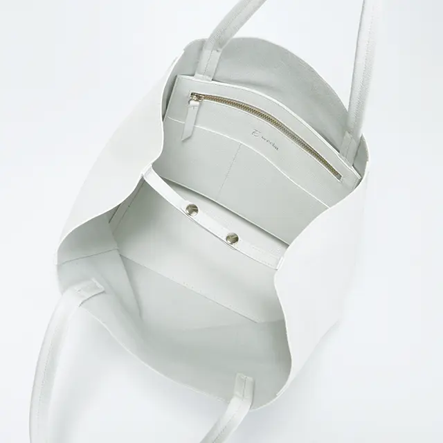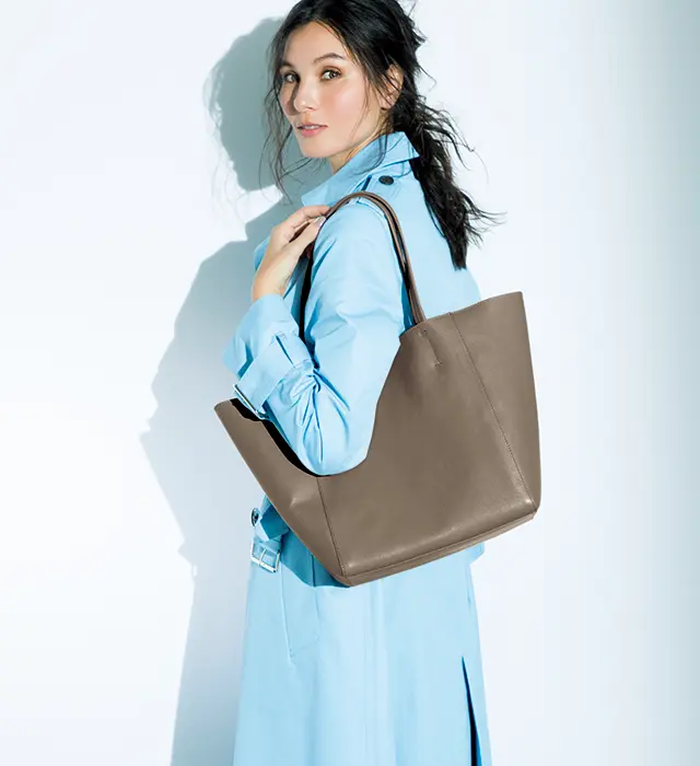 「収納力と機能性」「肩かけできること」「着こなしを選ばないルックス」「どんなシーンでも堂々と持てる上質感」「重いのはイヤ」……など、大人がデイリーバッグに求めるワガママな条件をすべてかなえる、究極のトートが堂々完成! ほのかなツヤをたたえた上質1枚革で仕立てたバッグは、なんと2通りの形で使用可能。両サイドの内側のベルトをつなげば上品なスクエアフォルムに、はずせばザクッとした大容量のトートに早変わり。しっかりしたレザーバッグなのに軽く、収納力がありながら肩にかけたときに収まりのいいサイズ感が絶妙。カラーはニュアンスたっぷりのトープと、クリーンで合わせやすいホワイトの2色展開。