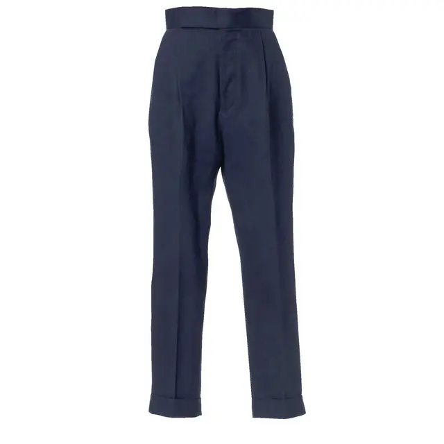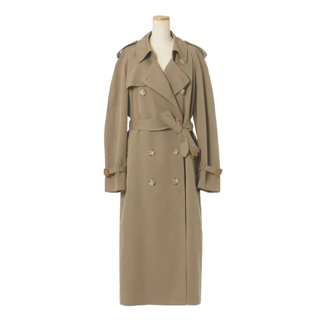 「若いイメージをもつ人もいるかもしれませんが、実はエクラ世代が安心して着られる大人カジュアルがそろうブランド。今回素材別注をしたワンタック入りのパンツは、ハイウエスト&テーパードシルエットでぐっと腰高に見せる今どきなデザインなのに、腰まわりゆったりではきやすい、まさに大人にうれしい一本。 今年らしい紫がかったネイビーで、きれいめに仕上げました。ひと目惚れしたオーバーサイズのトレンチとの相性もぴったりです。」(村山さん)
