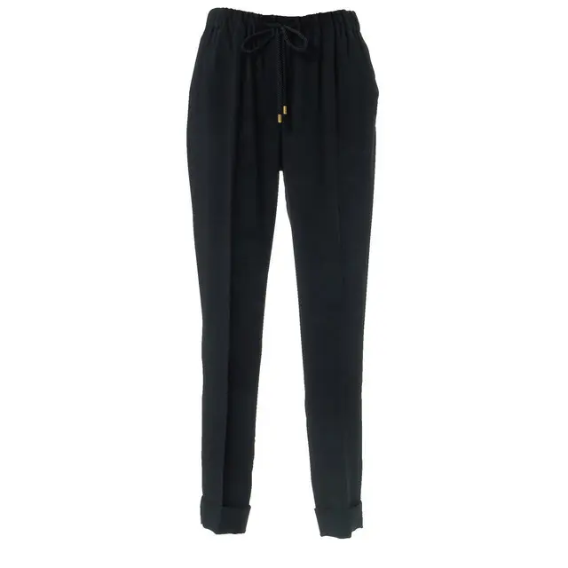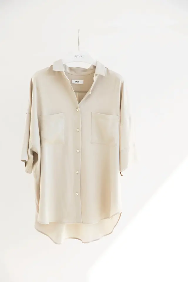 「窮屈感がなく、しわになりづらく、なのに、きれいめに着られるとろみ素材のセットアップ。 大人に向けた鮮度の高い服づくりに絶大な信頼をおいている『ハウント』とつくりました。 トップスはシンプルなシャツ型に見えて、後ろ身頃をオーバーサイズにすることでふわりとドラマチックな表情に。パンツはどんな体型の人がはいても本当にきれいな美脚シルエットが完成。黒×黒ならオールインワン風、ベージュ×黒は辛口エレガントな雰囲気に。」(村山さん)