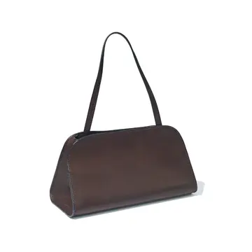 ぺたんこのシルエットが印象的なクラシカルムードのショルダーバッグ。ゆるやかなカーブを描くフォルムでボディに優しく添い、上質なラムスキンレザーの柔らかな肌ざわりとの相乗効果で、旅の疲れを癒してくれる。ジップフレーム、細いショルダーストラップ、便利な内ポケットなど、機能性は確保しつつ旅先にストレスなく持てるミニマルさが魅力。