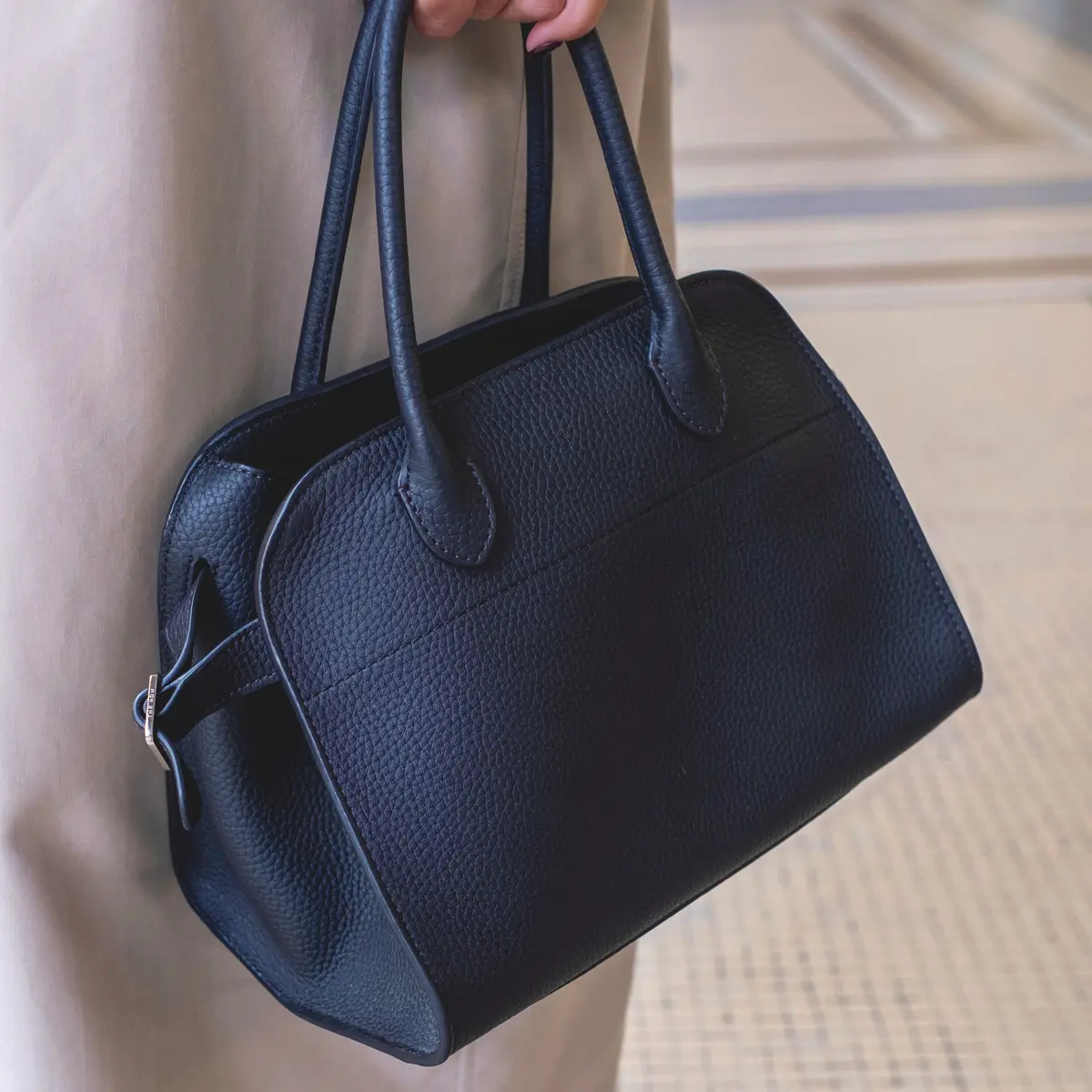 自分らしい選択でおしゃれを楽しんでいる海外マダムは、細部にもそのスタイルがにじんでいて素敵。そのコーディネートを盛り上げていた美しいフォルムのバッグと、そのあしらい方に注目。