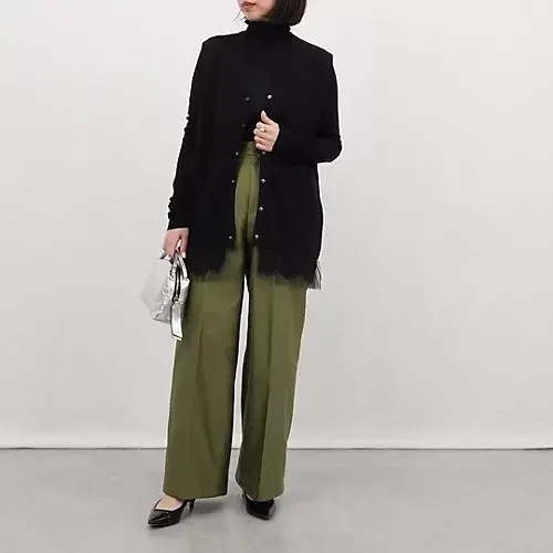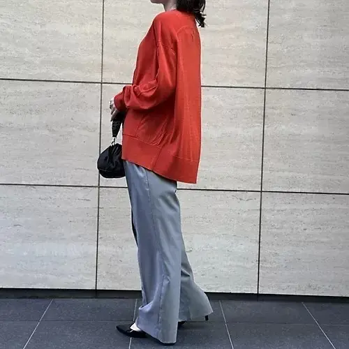 去年から再入荷をずっと待っていたタックパンツ。やっと手にして、やっぱりこの美シルエットは格別だと再確認しました。内側と外側の2タックが腰回りをすっきり見せ、淡いグレーが装いを軽やかにトーンアップ。小柄な私でも脚がすっと伸びて見える“3割増し”効果に感動。しわになりにくい素材で、シーズンレスで長く頼れる一本です。