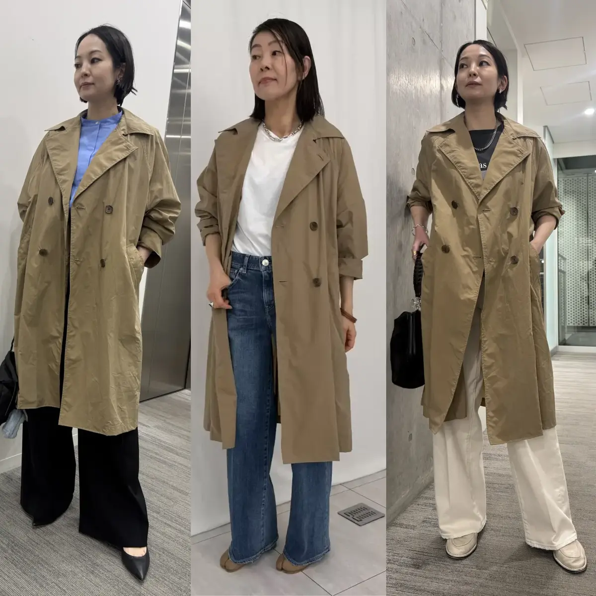 光沢を備えたステンカラーコートに、リネンシルクのイエローシャツ。春らしく軽やかなトップスレイヤードを、ウエストコードつきのタックパンツでよりコンフォートな方向へ。素材の上質さと、調和のとれたカラートーンで大人の品格を醸して。
