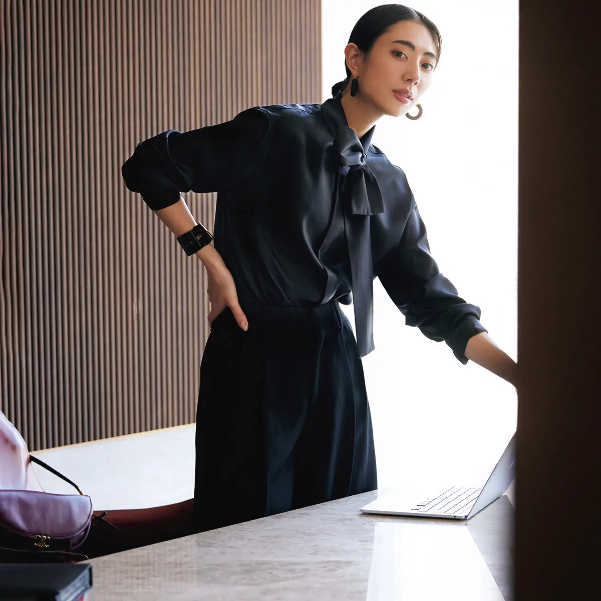 ジャケット¥522,500・スカート¥451,000・バッグ¥572,000・靴¥143,000(すべて予定価格)/セリーヌ ジャパン(セリーヌ) イヤリング¥440,000・リング¥352,000/ポメラート クライアントサービス(ポメラート)