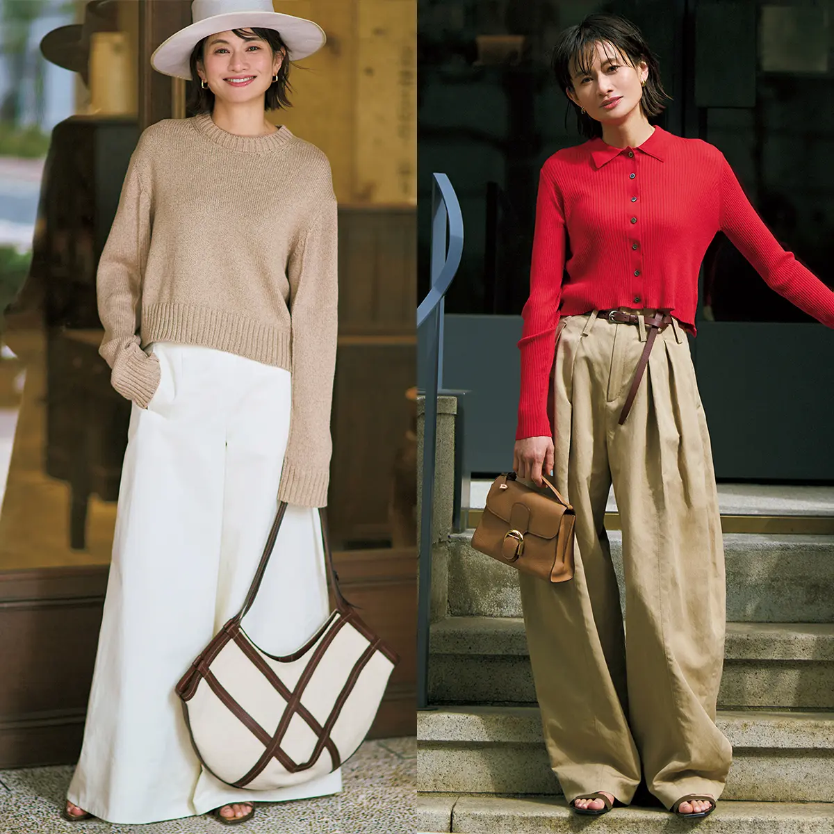 春のキーカラーのひとつ、エナジェティックな赤。短丈ニットで取り入れると軽やかかつチャーミングな印象がきわだち、デイリースタイルにすんなりなじむ。スポーティなポロ襟とリブの編み地も、気張らずにトライできるポイントに。ベージュのワイドチノで、今どきのトラッドカジュアルに仕上げて。