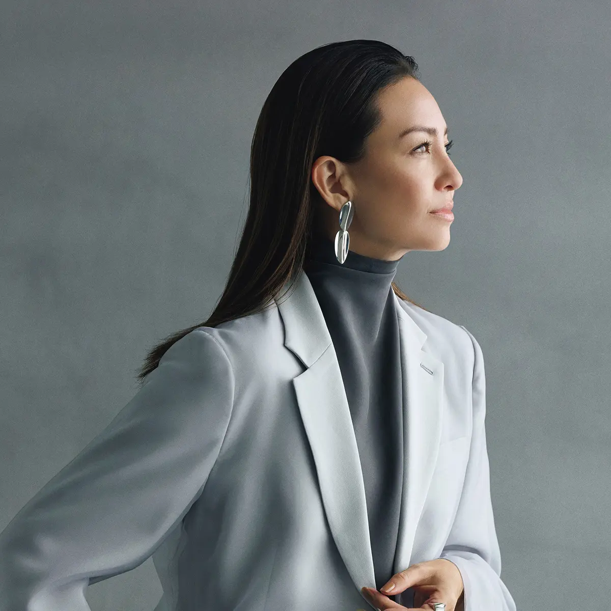 「程よいゆとりが体のラインをきれいに見せ、今らしい抜け感も醸せる。アウター気分で羽織ることもでき、多様な着こなしを叶えてくれます。色の軽やかさと、ピークドラペルなどメンズライクな要素のバランスも絶妙です」