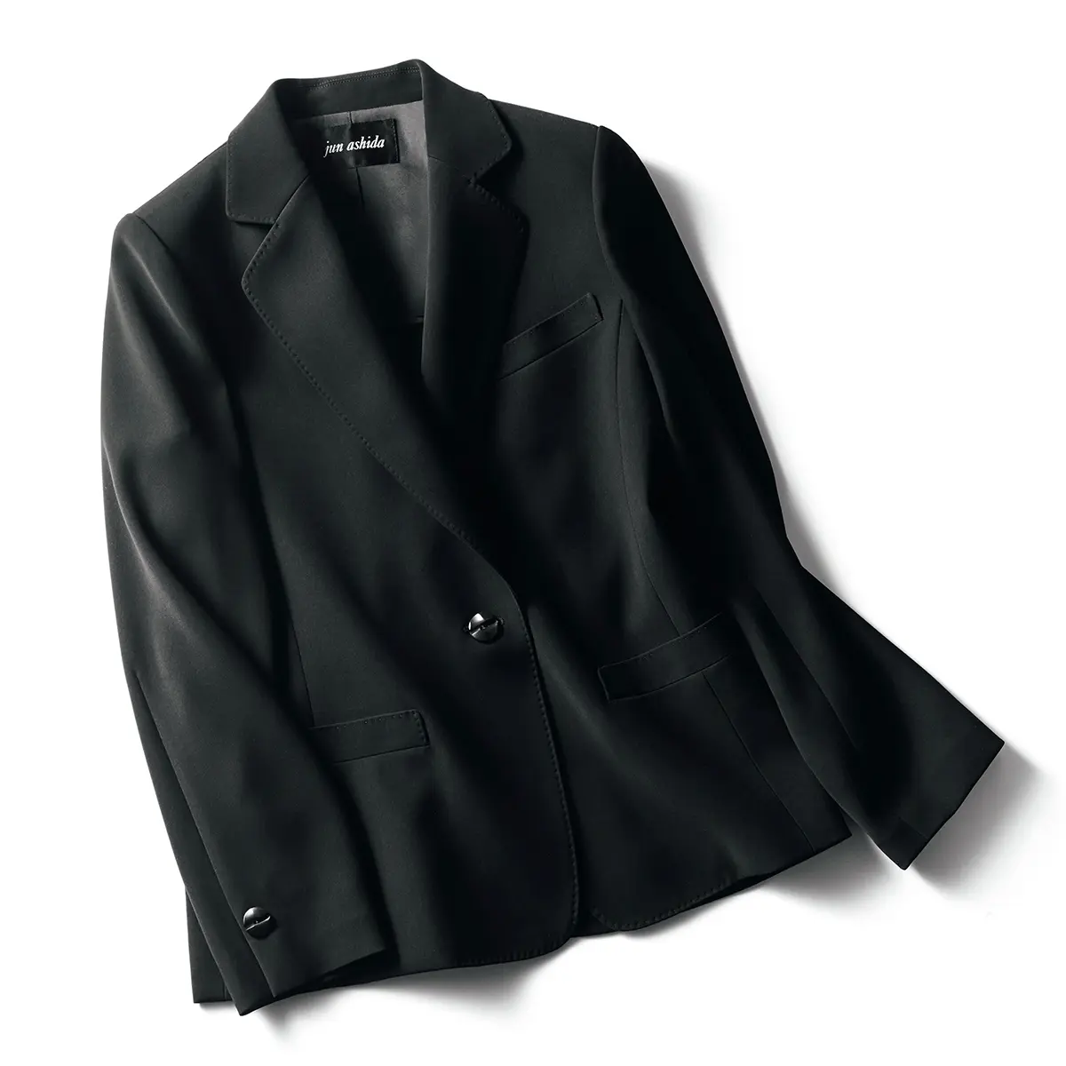 「シンプルな黒ジャケットですが、複数の素材を用いているので、のっぺりして見えず、奥行きのある表情に。オーバーサイズの今らしいシルエットでありつつ、肩には芯がちゃんと付けられていて、きちんと感もあるのが大人好み。洗練されたマスキュリンな佇まいで、颯爽と歩く姿がサマになります」
