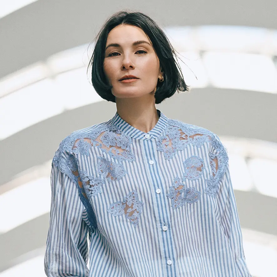 「適度なリラックスシルエットで、首元を開け、抜け感を出して着ると今らしく。仕立てがいいので、着崩れることもなく、品よく着こなせます。裾をアウトして、フレアスカートに合わせても素敵。あえて襟のボタンの片方を外して、スタンドカラーをちょっと見せたり、そういう遊びも楽しんでもらえたら」