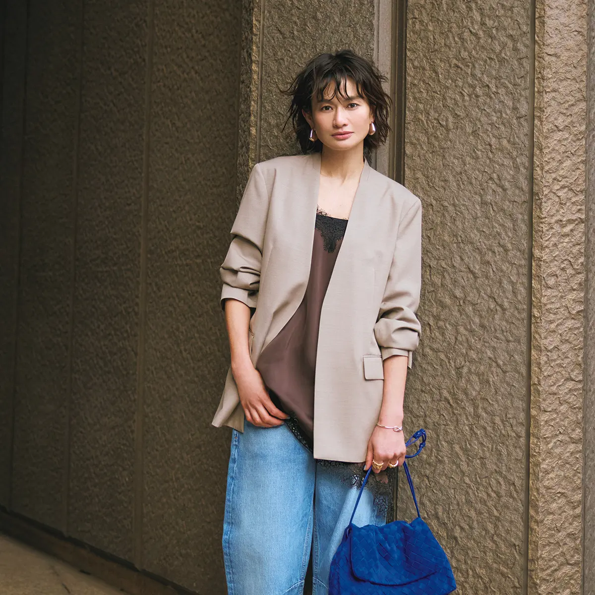 「フレアデニムは脚をすらっときれいに見せてくれ、個人的にも好きなシルエットです。これは少しゆとりのあるフィットで、ボディラインが目立ちにくく、リアルに履きやすい。それでいてハイウエストなので、腰周りをきれいに保つことができ、いいことづくし。ジャケット、抜け感のあるサンダルなど、マスキュリンなアイテムと合わせるのがおすすめです」
