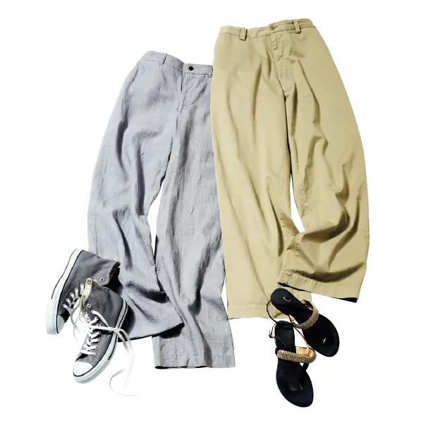 右のチノはマディソンブルーのメンズで、自分にはレディスよりも合ってすっきり見えるとチョイス。左のリネンはマーガレット・ハウエル。