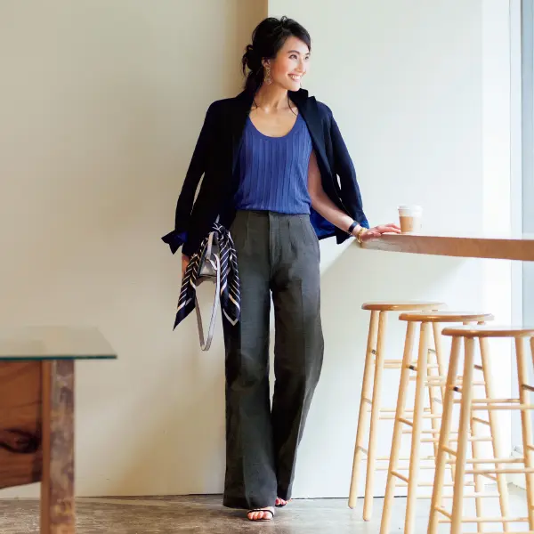 リネンライクの表情豊かでやや地厚な素材は体型を拾わず、ハイウエストの緊張感もトップスをインしたときのすっきり感も思っていた以上、と大絶賛。「今シーズンはTシャツではなく襟ぐりのあいたノースリーブニットを合わせたいんです。肌見せを緩和するはおりものもライダースやミリタリージャケットではなく、きれいめなテーラードで着こなすつもり」。今の坪田さんはパンツ選びも着こなしも、Notマニッシュが気分のよう。