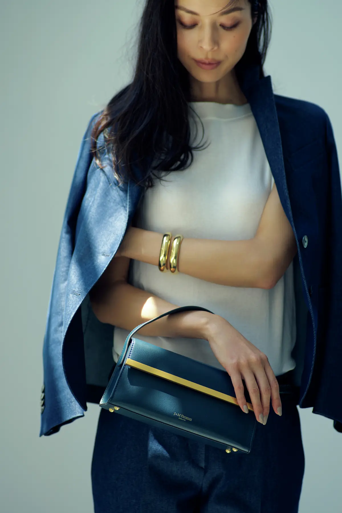 「クラシックなデザインの上質バッグは、カジュアルの格上げに欠かせません。対して足もとはパンプスは封印し、ローファーやスニーカーなど、フラットシューズを合わせた意外性をねらいます」