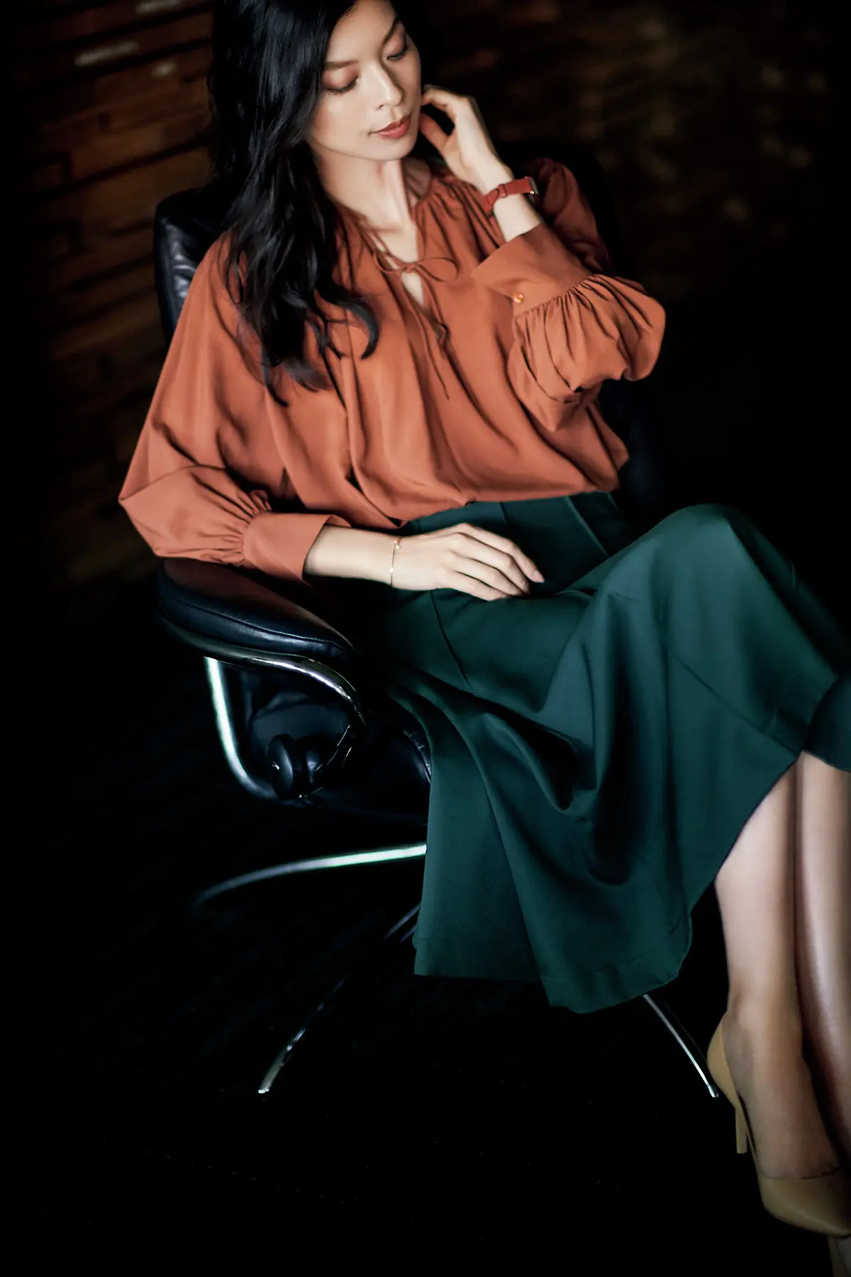 華やかな仕事の席には、赤みブラウンと 知的グリーンで鮮度を上げて エグゼクティブにふさわしい、シルク100%のとろみブラウスは人気色の赤みブラウン。濃いめのグリーンのスカートに合わせると、大人の落ち着いた雰囲気もありながら、センスのよさもアピールできる。ブラウスの上にネイビーやブラックのジャケットをはおれば、会議やレセプションなどオフィシャルな場にも通用するスタイルに。