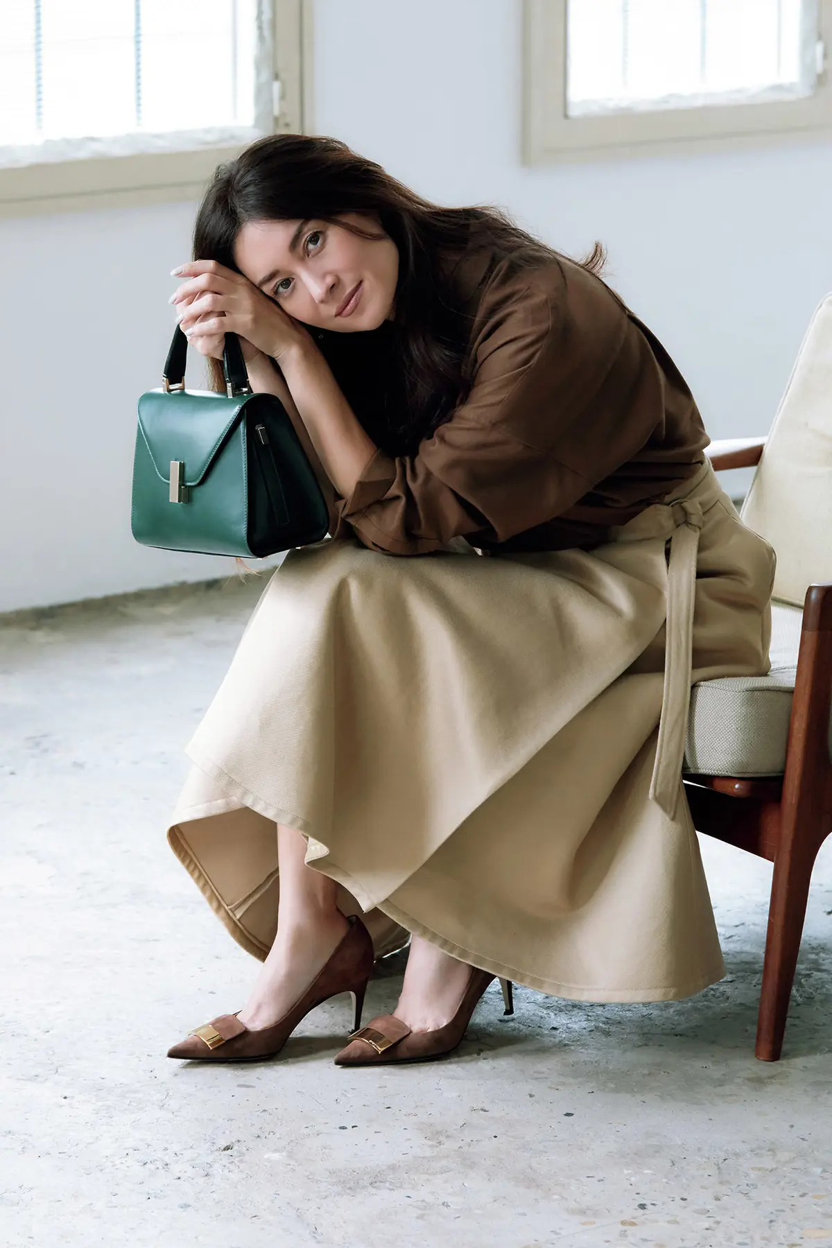 レディなパンプスを添えて 秋ムードのフェミニンコーデに 秋に映える、ベージュからブラウンの濃淡でつくるレディなムードが漂うワントーンコーデ。ロング丈のラップスカートの足もとに、バックスキンのマットなブラウンとゴールドのプレートが品よいアクセントになって。秋らしい濃色グリーンのバッグをポイント使いにして、さらに装いをブラッシュアップ。