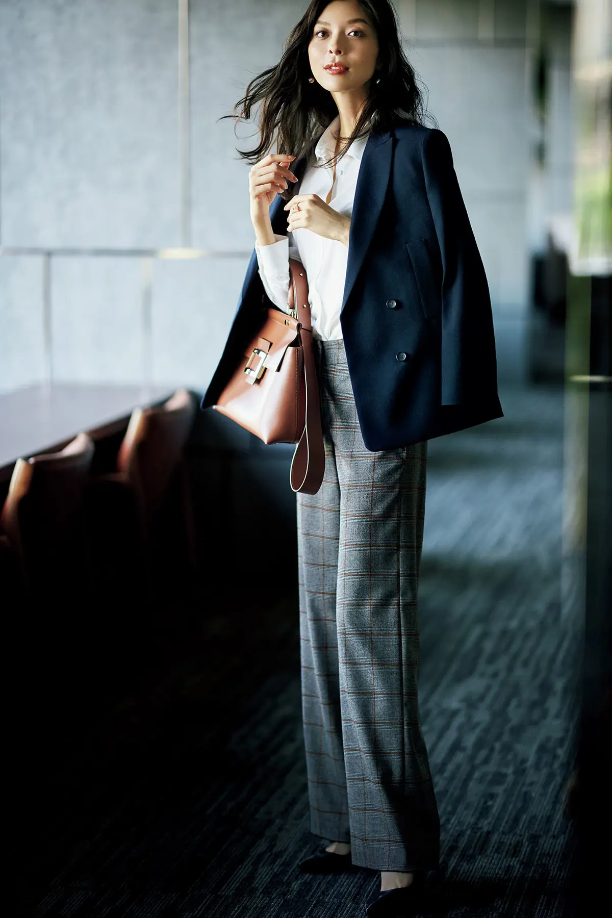 パンツ¥32,000/リンク・セオリー・ジャパン(セオリーリュクス) ジャケット¥68,000/ebure(エブール) ブラウス¥20,000/エプタモーダ(エンビ) ピアス¥770,000・リング¥240,000/TASAKI(M/G TASAKI) バッグ¥326,000/ロジェ・ヴィヴィエ・ジャパン(ロジェ ヴィヴィエ) 靴¥92,000/ブルーベル・ジャパン(マノロ ブラニク) -