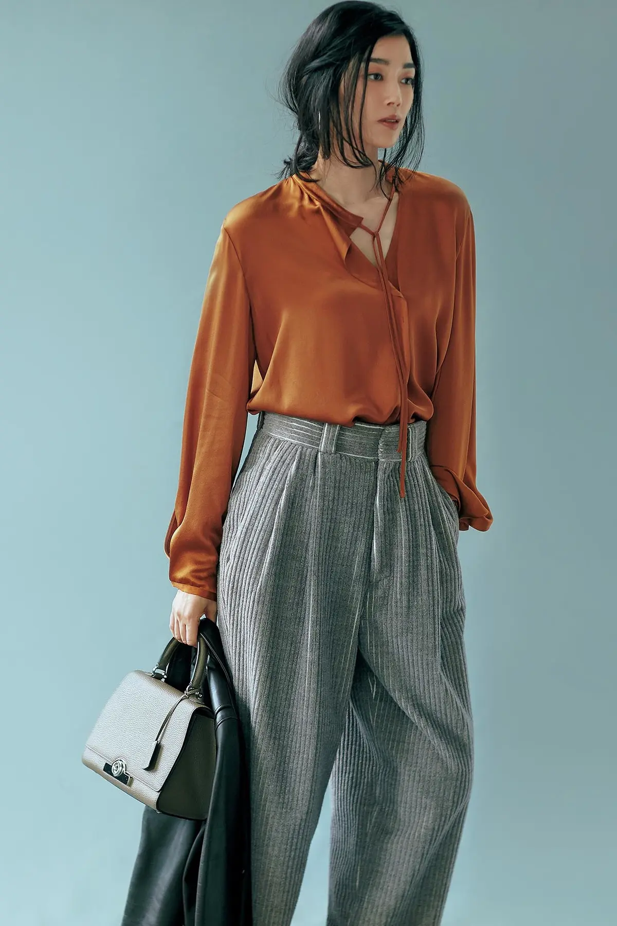 パンツ¥31,000/FUN Inc(. アイロン) ブラウス¥36,000 /ビームス ハウス 丸の内(エッフェ ビームス) バッグ¥33,000 /ティーアンドエル(トフ アンド ロードストーン) ストール¥42,000 /リンク・セオリー・ジャパン(ファリエロサルティ/セオリーリュクス) 靴¥52,000/アマン(ペリーコ)